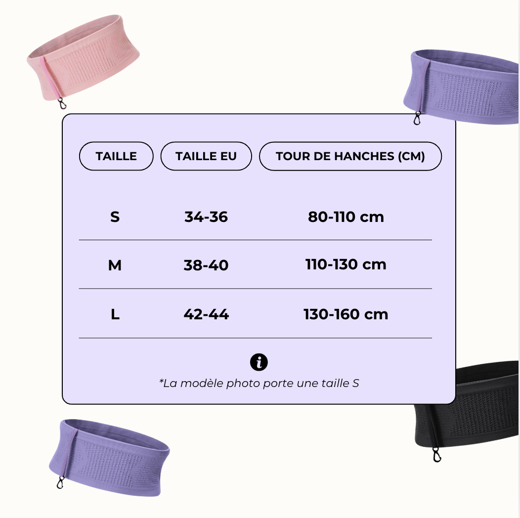Mais si tu veux que ta ceinture reste bien en place pendant que tu cours (sans rebond, sans glissement), prends la plus ajustée. Elle est extensible et épouse bien le corps.